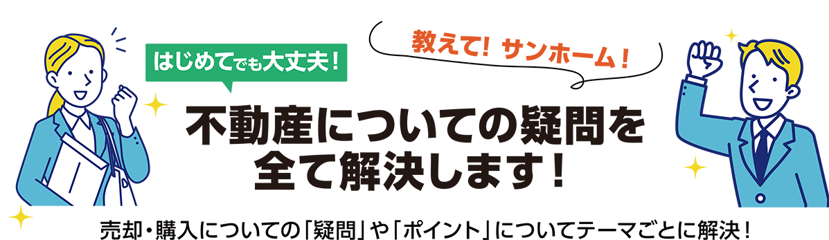 不動産の売却を考えたら、まずはお近くのサンホームにご相談ください。(各店舗の所在地はこちら)お住み替えを成功させるために、ご希望や条件を整理しておくと、イメージも明確になり、購入計画もスムーズです。もちろん相談だけでも承っております! |